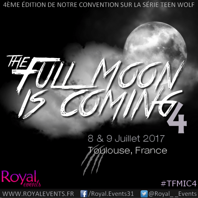 Le prochain événement aura lieu à Toulouse les 8 et 9 juillet prochain et accueillera de nombreux acteurs de la série Teen Wolf pour la quatrième édition de la The Full Moon is Coming. Ainsi, vous pourrez rencontrer Holland Roden (Lydia Martin), Ryan Kelley (Jordan Parrish), Shelley Hennig (Malia Tate), Dylan Sprayberry (Liam Dunbar), Khylin Rhambo (Mason Hewitt), Ian Bohen (Peter Hale), Max et Charlie Carver (Aiden et Ethan Steiner), Lindsen Ashby (Noah Stilinski) et Susan Walters (Nathalie Martin). À noter que certains d’entres eux sont extras-guests (photos/autographes non inclus dans les pass). Seuls les photos et autographes des quatre premiers acteurs sont inclus dans les pass.